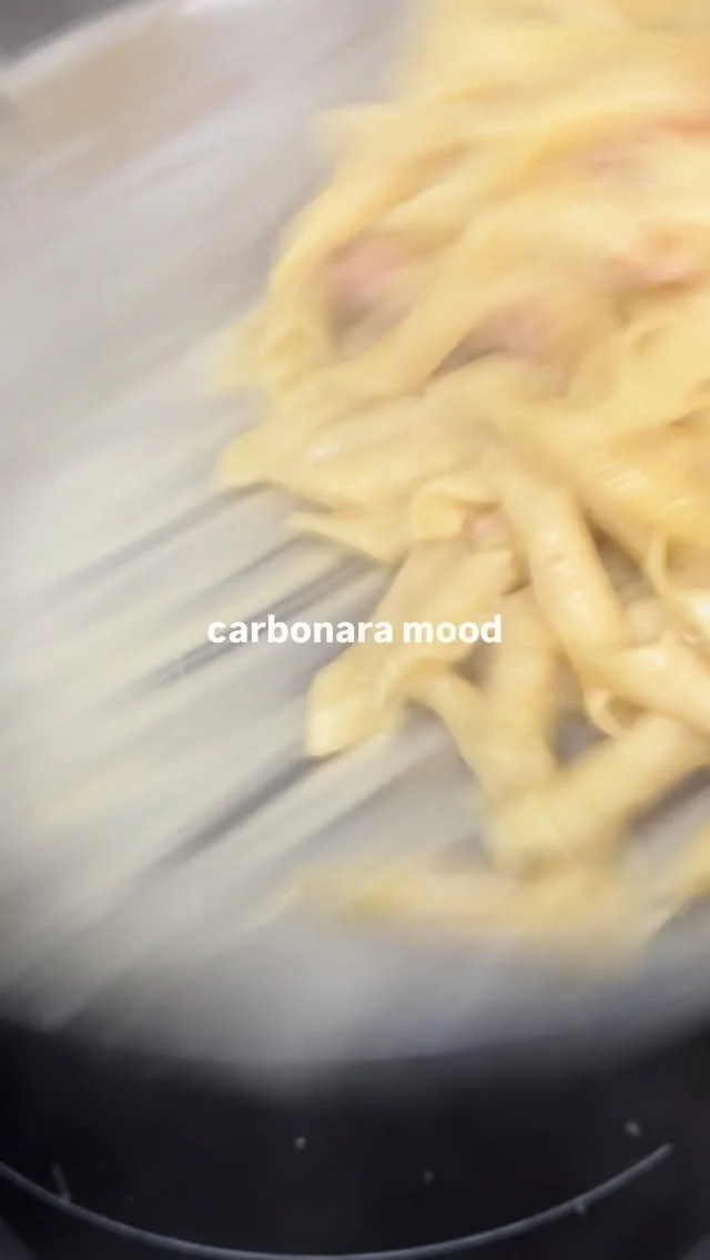 Close-up of a bowl of Carbonara spaghetti pasta, with cream sauce and cooked guanciale bits, served in a brown disposable bowl.